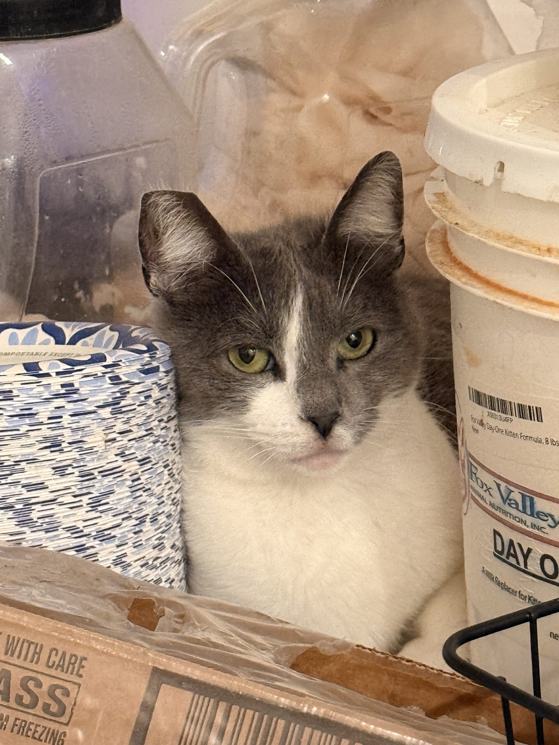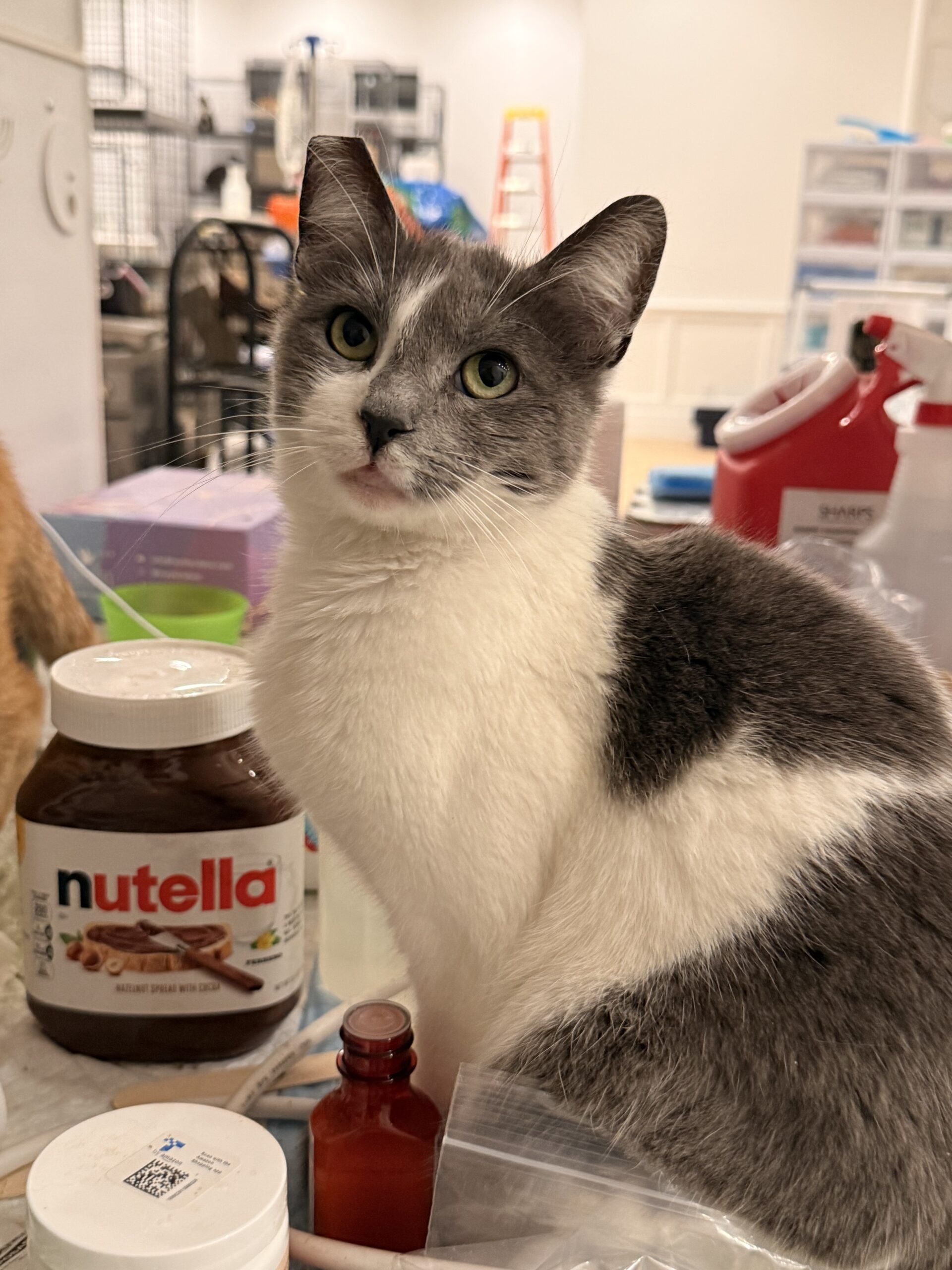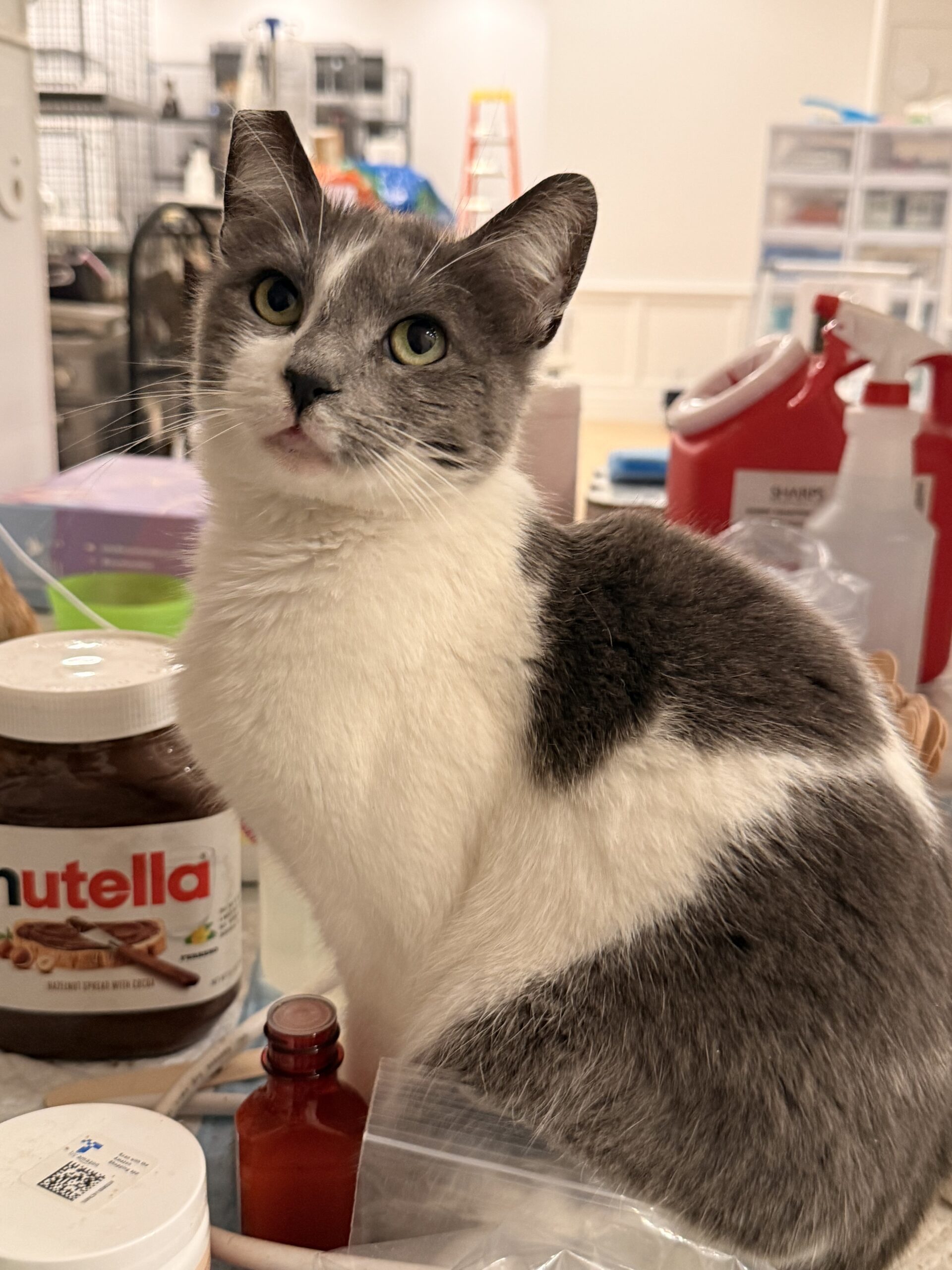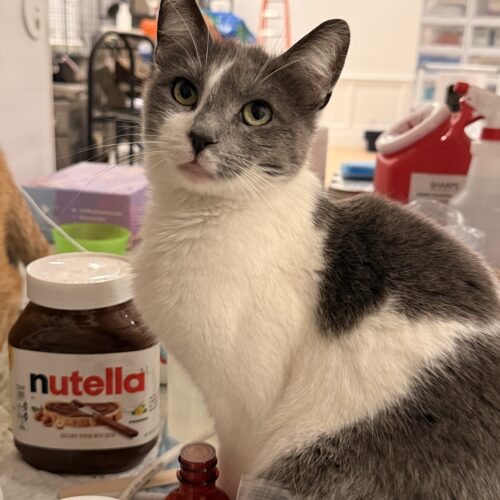 Hitch knew a good deal when she saw one. She saw the party all the rescue cats were having indoors and found a way into our building through a gap in the catio, and made herself at home. We didn't catch on to our interloper for at least a week, because Hitch would hide whenever we came in the room. Eventually we noticed and captured her, but rather than turn her back onto the street, we set her up in the rescue. After all, Hitch had worked hard to get into the club!
